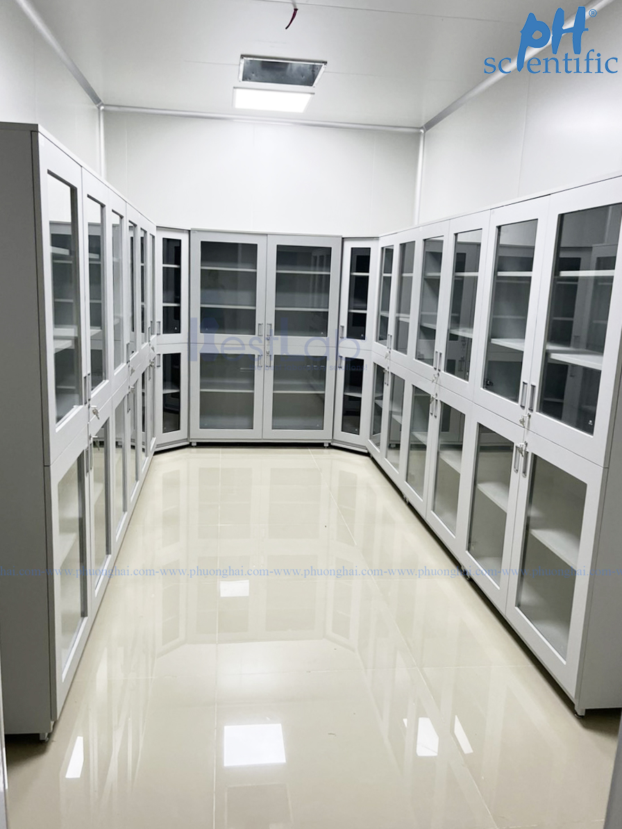 - Dãy tủ đựng hóa chất cũng là một phần không thể thiếu của phòng thí nghiệm. Chúng được sử dụng để lưu trữ các hóa chất, mẫu và vật liệu quan trọng trong môi trường an toàn. Các tủ được chế tạo từ vật liệu chịu hóa chất mạnh và có cơ chế khóa an toàn để tránh các tai nạn không mong muốn.