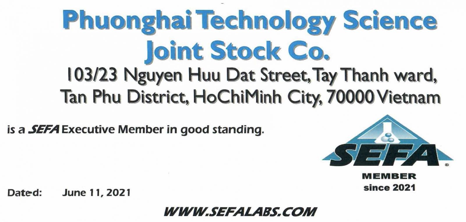 Phượng Hải JSC đang là thành viên của Hiệp Hội Nội Thất và Thiết Bị Khoa Học SEFA - Mỹ (The Scientific Equipment and Furniture Association). Đây là một hiệp hội hàng đầu của Mỹ với các tiêu chuẩn nổi tiếng đang được rất nhiều tổ chức/ khách hàng sử dụng để làm tiêu chuẩn áp dụng.
